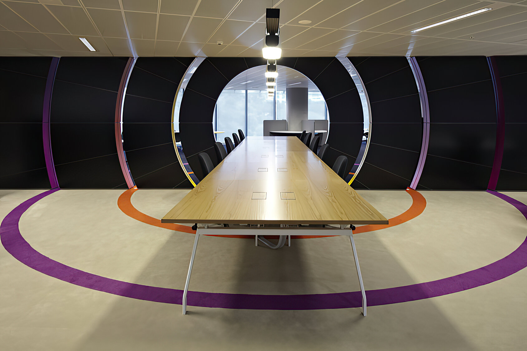 The interior fit out for the Commonwealth Bank is colourful and unique. It promotes the use of activity based desking throughout as well as creative meeting rooms and meeting zones. Some of the one off creations include a large yellow cube opening into a cloud filled sky, a spiral meeting room, a puzzle wall, and internal pergola structures.