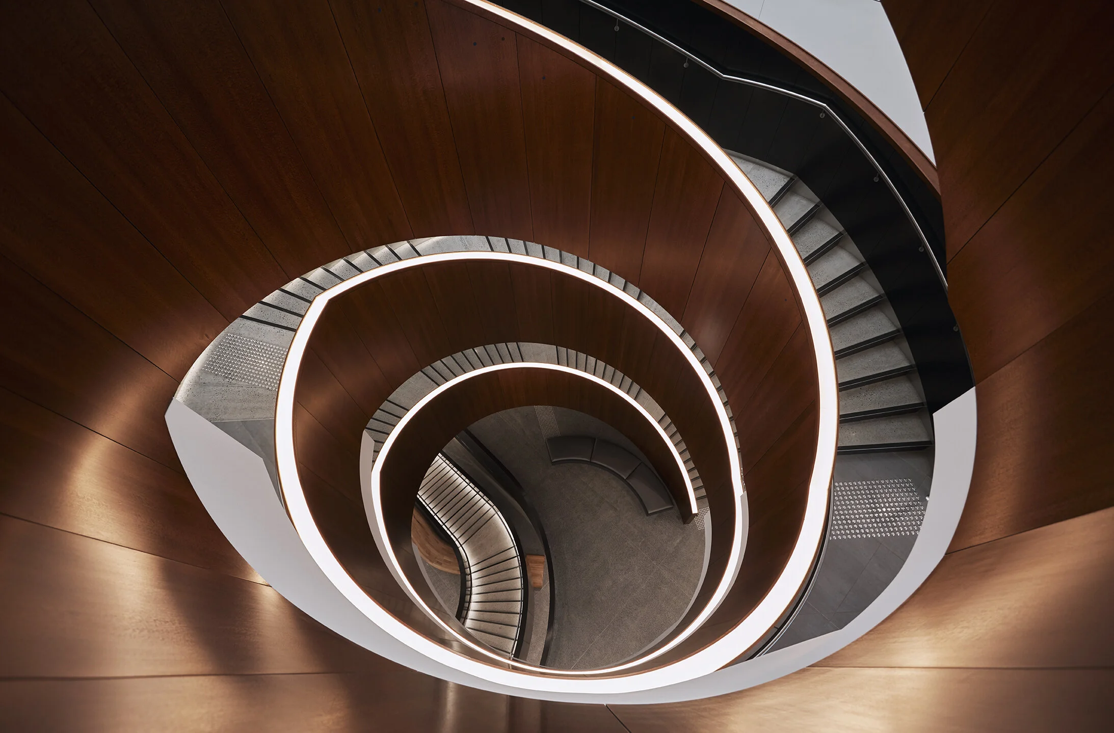 Civardi has been proud to complete the fitout of the 5 storey spiral staircase in the Abercrombie school of business building for the University of Sydney. The staircase is clad externally with curved veneer panels and internally with powder coated aluminium panels.